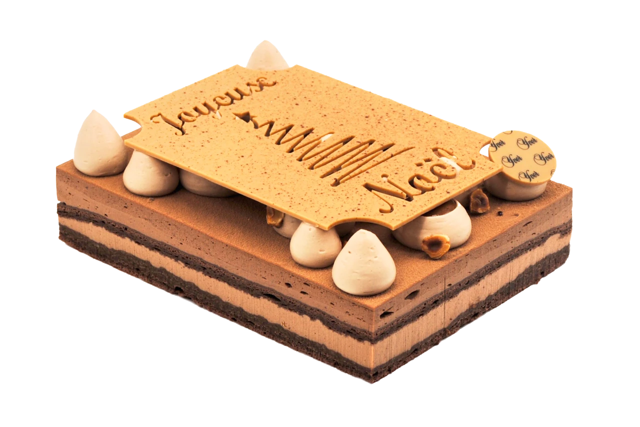 Biscuit moelleux chocolat, feuilletine, crémeux chocolat-praliné, craquant chocolat, mousse chocolat noir Guayaquil 64%.