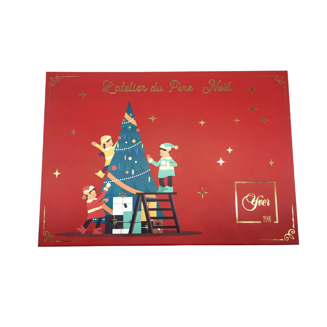 Chaque année, le calendrier de l’Avent est une nouveauté surprenante très attendue. En 2025, ce calendrier « L’atelier du Père Noël » avec 24 cases garnies de 200 grammes de chocolats assortis, sablés, pâte de fruits, guimauves vous ravira.