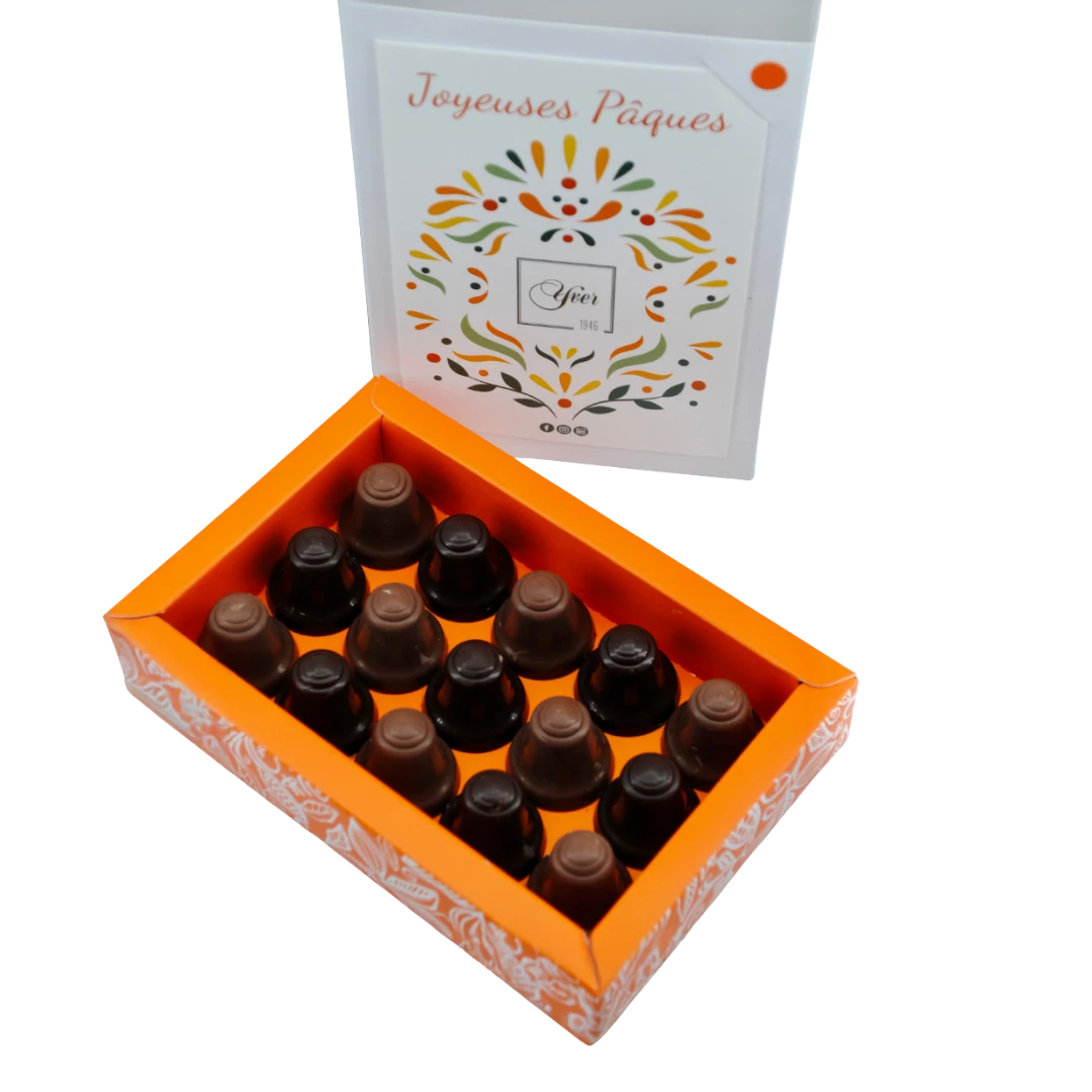 Coffret 15 cloches au praliné enrobées de chocolat au lait ou de chocolat noir.